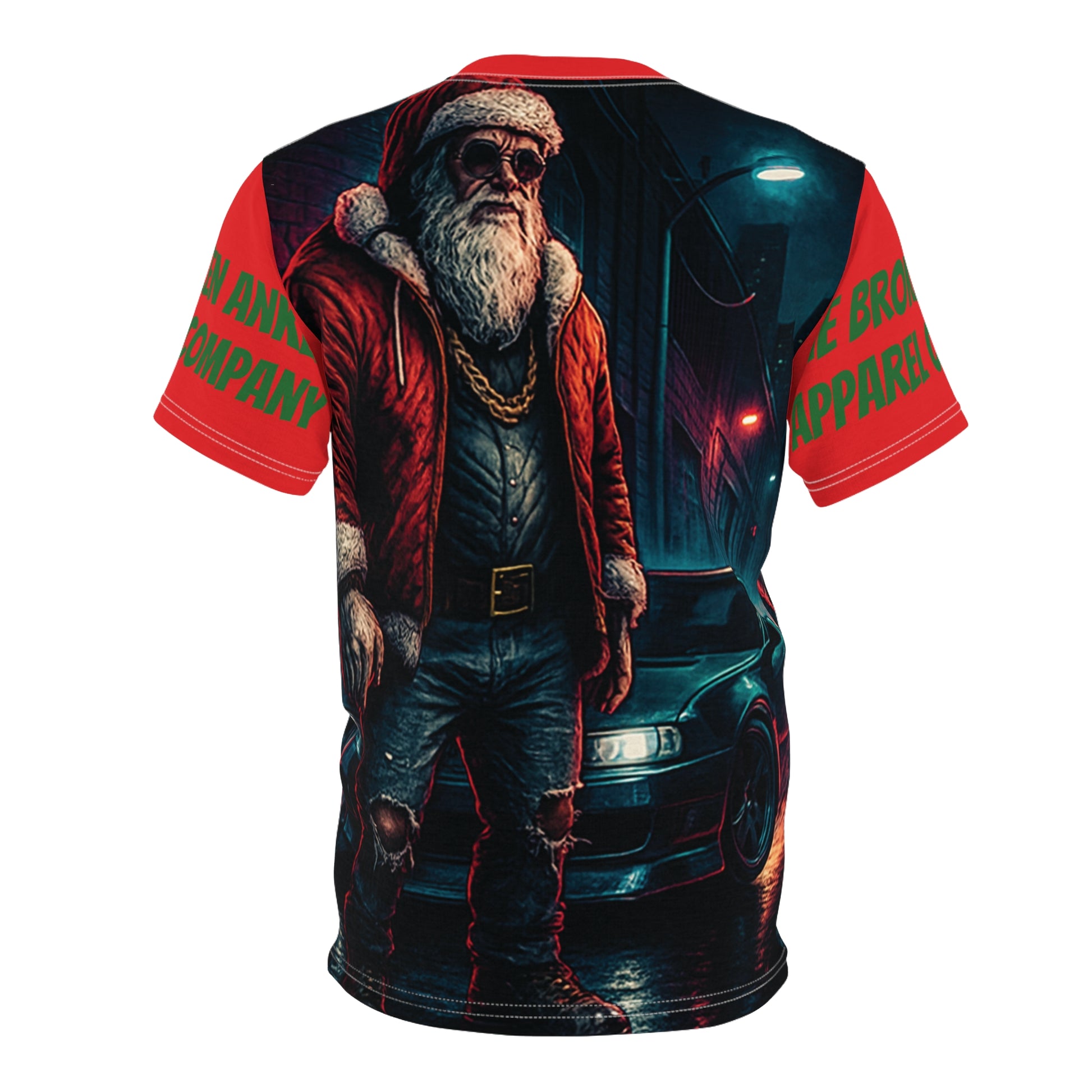 This all-over-print tee brings a bold, streetwise twist to holiday imagery. A rugged, urban Santa stands under neon lights by a low-slung car — leather, gold chain, and attitude — rendered across the full shirt for a cinematic, in-the-moment look. The red raglan sleeves and collar frame the scene and add contrast, while the soft, durable polyester holds the vibrant colors wash after wash. Wear it when you want to mix seasonal spirit with late-night city energy; it reads like a short story in fabric, sparking comments and starting conversations wherever the night goes.